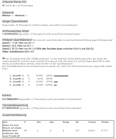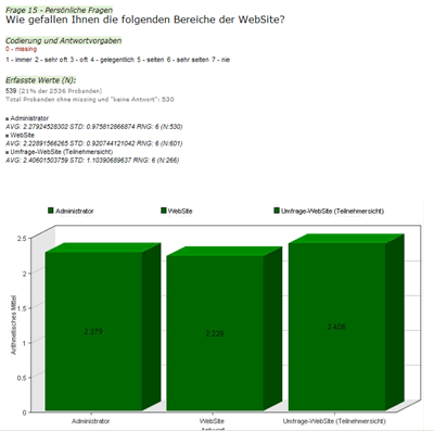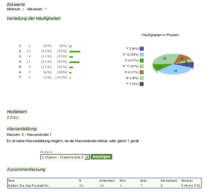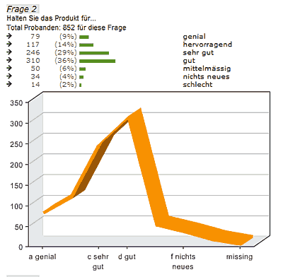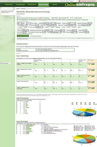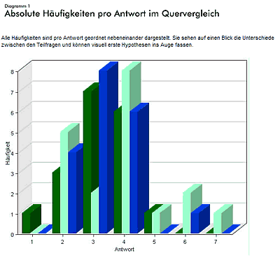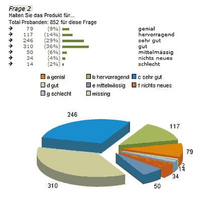 Ob Sie zusammenfassende Diagramme oder eine wissenschaftliche Analyse Ihrer Befragung benötigen, ein Knopfdruck liefert Ihnen die gewünschten Ergebnisse anschaulich dargestellt. Unser LiveStat-Server liefert Ihnen Zwischenergebnisse, auch wenn eine Befragung noch nicht abgeschlossen ist. Sogar Hochrechnungen sind möglich.