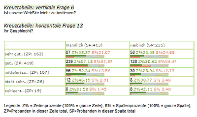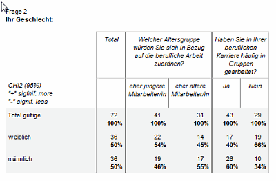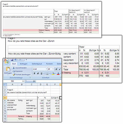 Subgruppen-Vergleiche, auch multiple, direkt in der selben Tabelle für alle Fragen. Direkt-Export nach Excel mit Copy/Paste (z.B. für Ergänzung mit eigenen spezifischen Diagrammen) per Mausklick.