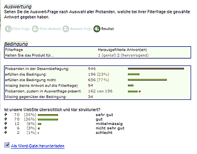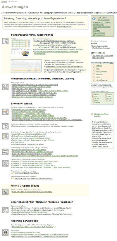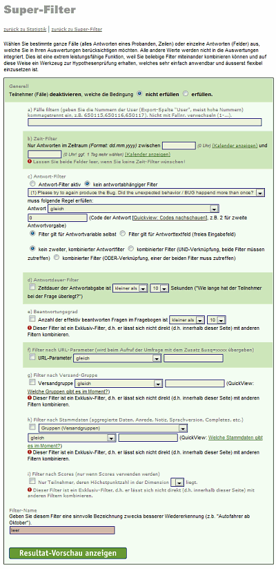 Filter von Antworten nach Fallnummern, nach Zeit (Antwortzeitraum, z.B. "nur Januar bis März"), nach Antworten auf bestimmte Fragen (z.B. "nur Vertriebsleiter") - kombinierbar mit UND/ODER Bedingungen, Antwortdauer-Filter (z.B. Eliminieren aller Teilnehmer, die weniger als 2 Sekunden für eine Antwort benötigt haben - "Durchklicker"-Bereinigung), Beantwortungsgrad-Filter (nur Teilnehmer, die mehr als 10 Fragen beantwortet haben), Filter nach URL-Parameter (URL-Parameter, die mit dem Umfragelink übergeben wurden), Filter nach Versand-Gruppe (Mailinggruppe), Filter nach Stammdaten (beliebige Daten, die mit den Teilnehmeradressen importiert wurden), Filter nach Scres (Summierte Werte ja nach Antwortverhalten, z.B. bei psychologischen Tests oder Quiz / Lernkontrollen)