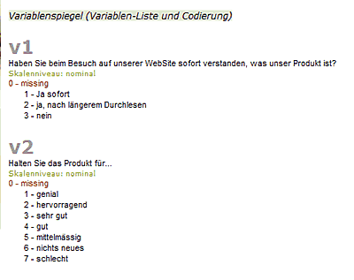Druckformatierte Variablenliste zur einfachen Identifikation der Variablen bei Export