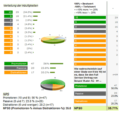 Ermitteln Sie die Loyalität Ihrer Kunden mittels dem bekannten Konzept des Net Promoter Score® (NPS®) und zeigen Sie die Ergebnisse direkt mit unserer passenden Spezialauswertung