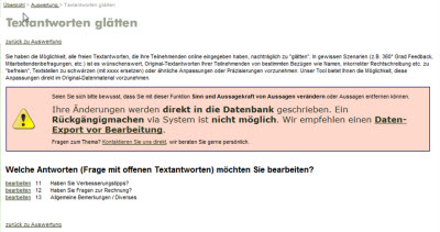 "Glätten" von offenen Textantworten zur Nachbearbeitung (z.B. Rechtschreibung, Zensur von Namen oder persönlichen Angaben, Einfügen von redaktionellen Anmerkungen, etc.)