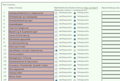 Definieren Sie Überbegriffe (Indices) wie Arbeitszufriedenheit, Klima, Team & Kollegen usw.