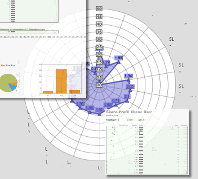 Das System erreichnet automatisch Mittelwerte für jedes Thema (für jeden Index) über alle enthaltenen Fragen hinweg inkl. standardisierte, vergleichbare Prozentwerte.