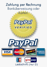 Bezahlung per Rechnung - Zahlungsmittel Banküberweisung (Konten in D und in der Schweiz), Kreditkarte, PayPal, GiroPlus.