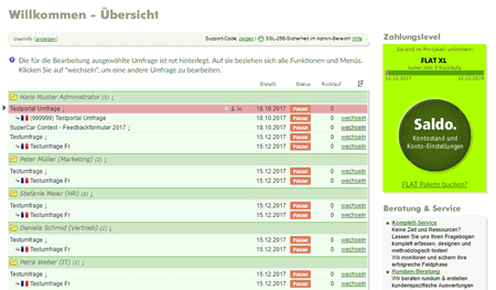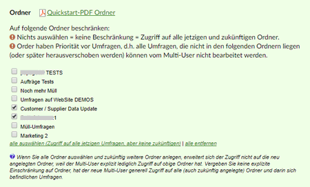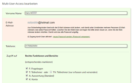 Administrator-Account mit Zugriff auf sämtliche Ordner und Umfragen aller Multi-User (konfigurierbar, falls gewünscht).