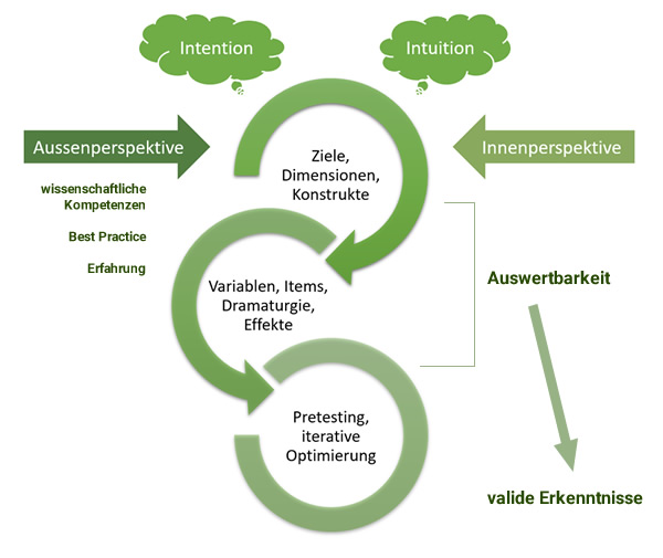Deduktiv aus Theorie, induktiv-empirisch aus eigenen Items und Feldtest (Trial und Error), intuitiv, mittels Abgleich bestehender etablierter Konzepte & Skalen (erprobte themenspezifische Instrumente), Unternehmens-Expertise