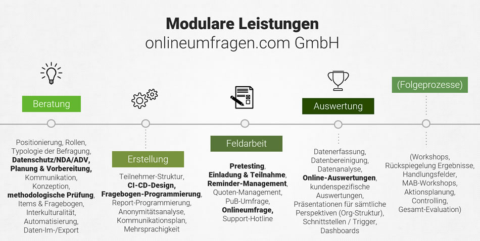 Projektmanagement, Termine, Sicherheit, fehlerfreier Ablauf, methodische Beratung, Fragebogenbegutachtung und Umsetzung durch unser Team, Pretest, CI/CD und mehr.