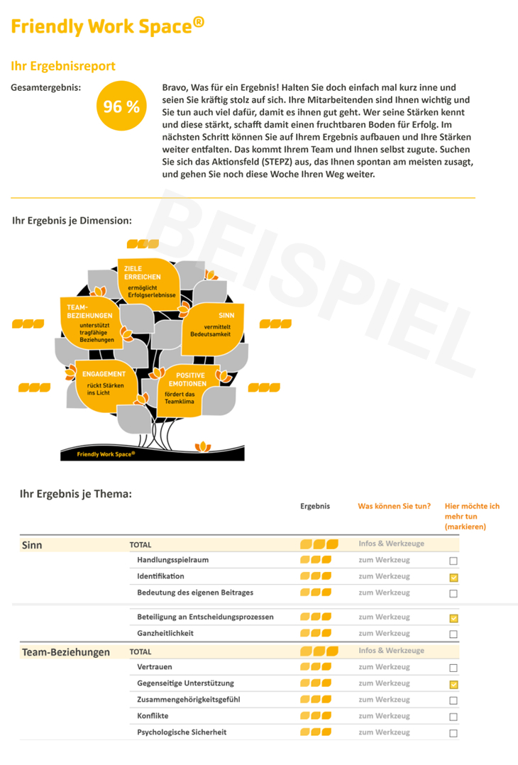 • Auswertung für Teilnehmende direkt im Fragebogen angezeigt und als persönliches PDF herunterladbar