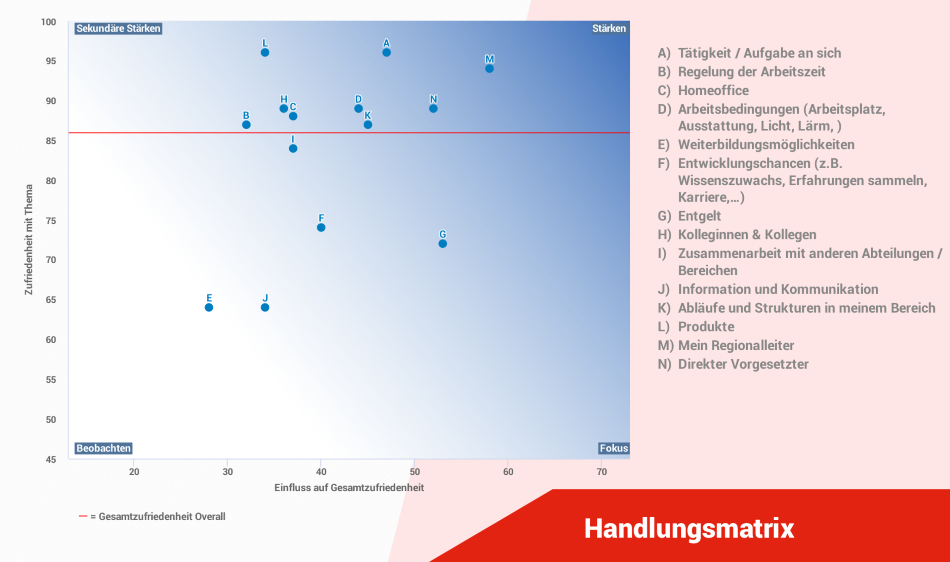 Bestandteil unserer Enterprise-Dashboards, in OU CustomCharts oder isoliert. Zeigt auf einen Blick, wo gezielte Maßnahmen die größte Wirkung auf KPIs wie z.B. Zufriedenheit, Engagement oder Weiterempfehlungsbereitschaft entfalten.